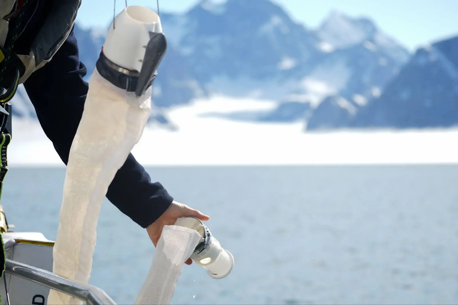 The water at the foot of the Kronebreen and Kongsvegen glaciers is murky, filled with meltwater sediments. We are surrounded by icebergs, some of which broke off from the glaciers right before our eyes, accompanied by that characteristic thunderous sound and impact wave. What a perfect place for a sample, right? We are eager to find out what's lurking beneath the water between these ice masses and jagged mountains.
