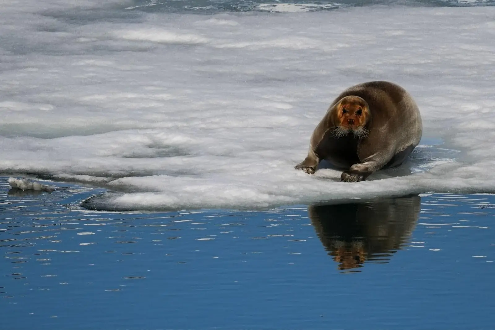 The water, at 7.3°C, is quite warm, and a thick fog is settling in. While the net drags behind the boat, curious bearded seals pay us a visit, and a walrus swims in the distance.