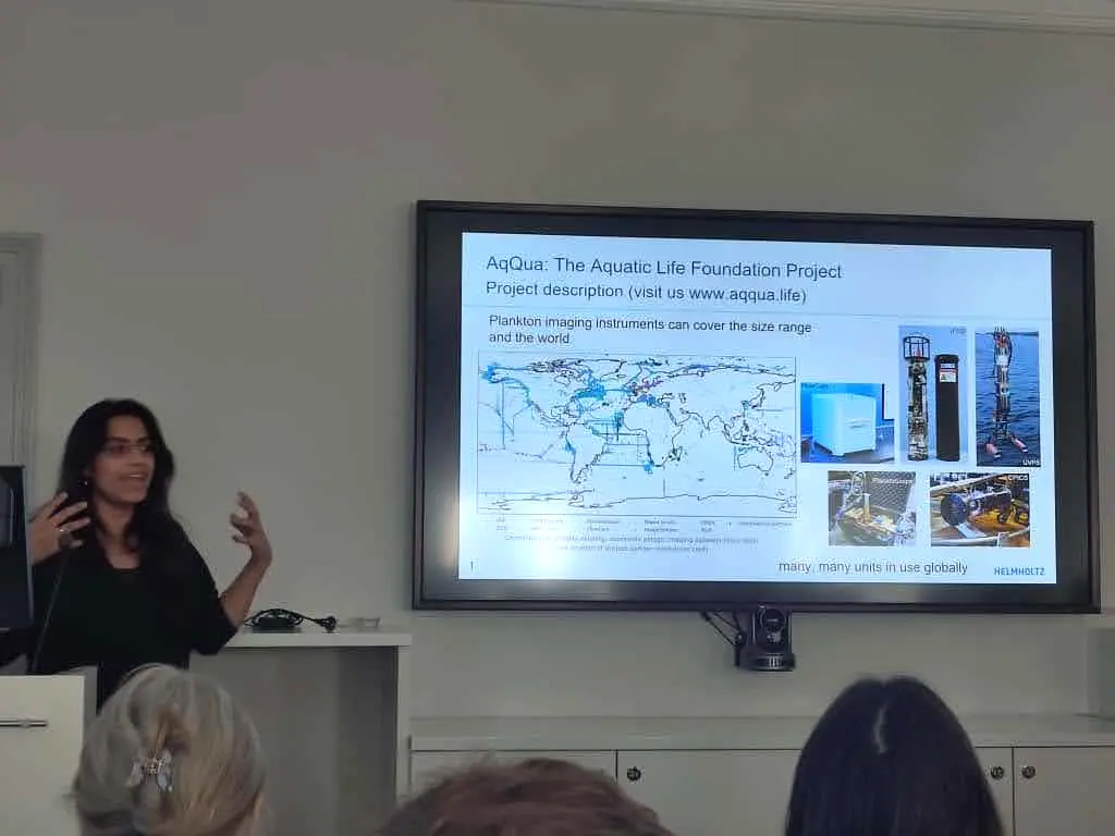 Ankita Ravi Vaswani from the Helmholtz Foundation Model Initiative presenting during the ICES-IOC Workshop. Her talk introduced the AqQua project, focused on building an aquatic life foundation model using global plankton imaging datasets, with slides showing worldwide deployments and advanced imaging instruments.