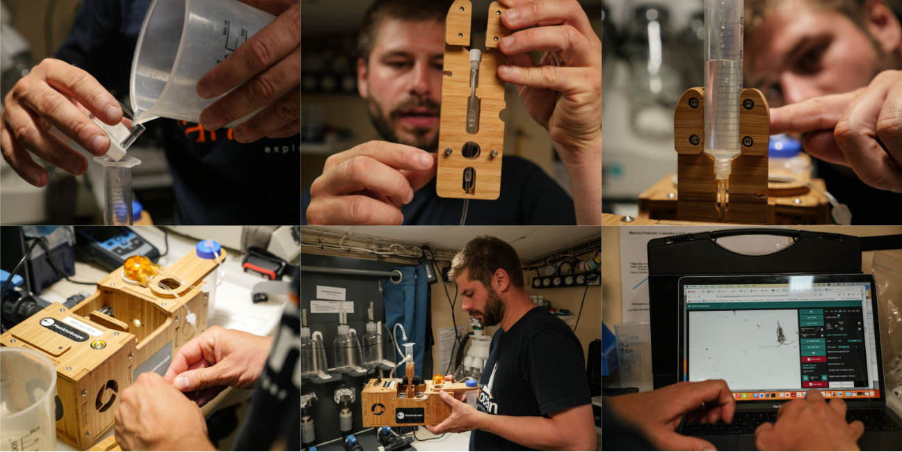 Use of the PlanktoScope in the ‘Sorting Lab’ on board Tara, with the various stages from sample filtration to acquisition. Photo credits: Agathe Roullin / Tara Ocean Foundation.
