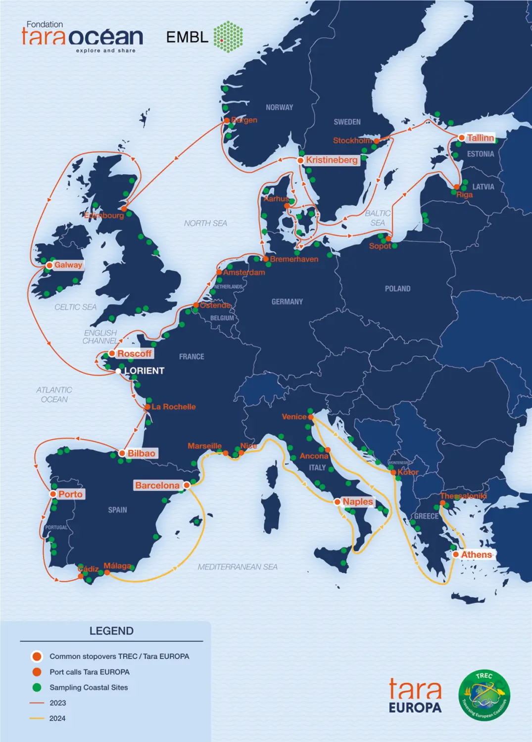 This is also where the connection with TREC appears. TREC is a scientific campaign combining a marine campaign, called Tara Europa, led by the Tara Ocean Foundation, and a land-based campaign led by EMBL. Since its launch, more than 70,000 samples have been collected across 115 transects from Finland to Greece. The TREC campaign explored the European basin in three dimensions (latitude, longitude, depth) and, to include time, relied on sediment cores and PlanktoScopes in fixed locations. The goal is to keep latitude and longitude constant and observe how ecosystems evolve through repeated measurements.
